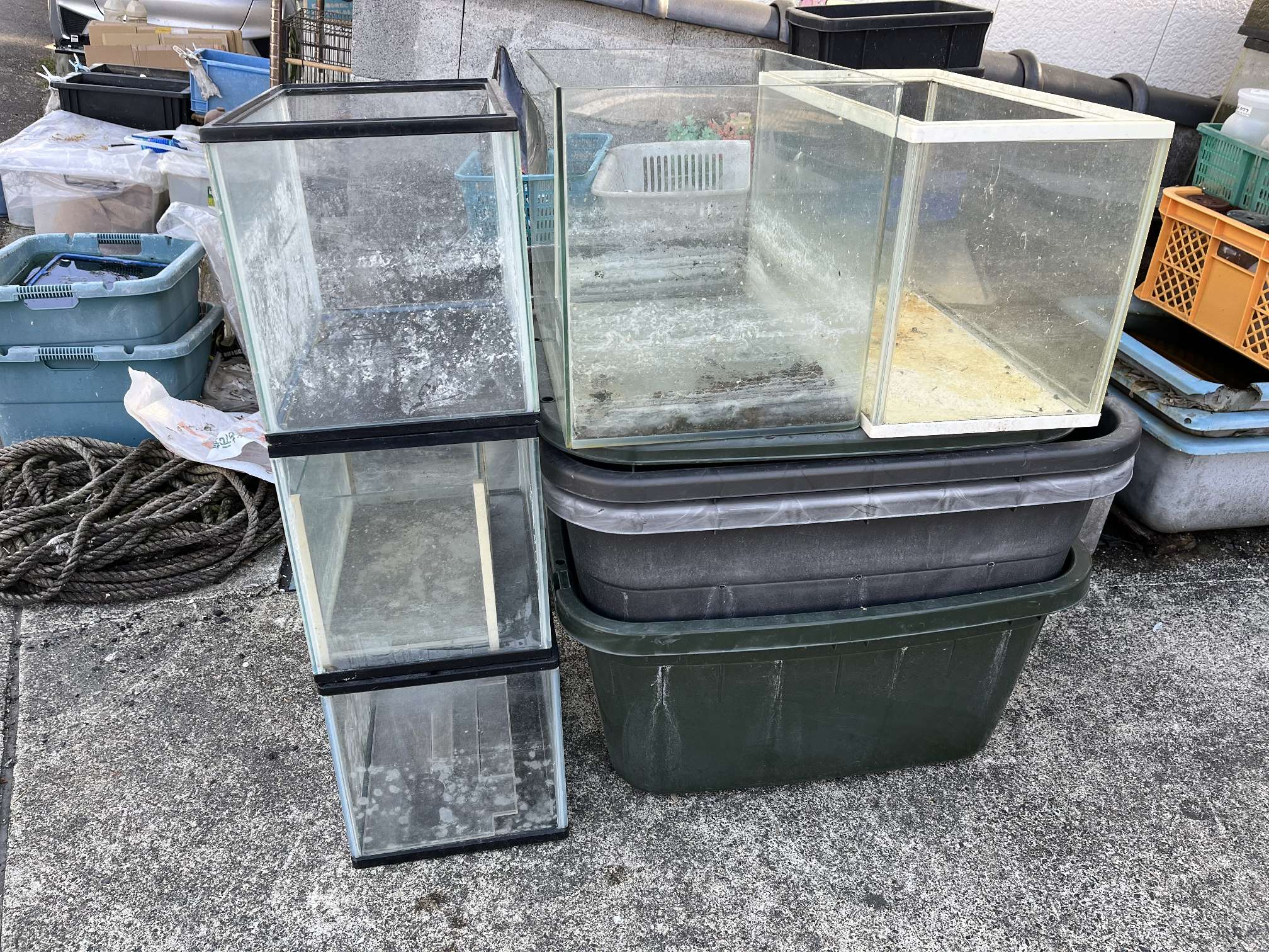 タライ4台 水槽40×3本、45曲面オールガラス×1本、50スリム×1本、36×1本 *タライ4台引き取って頂きました。 |